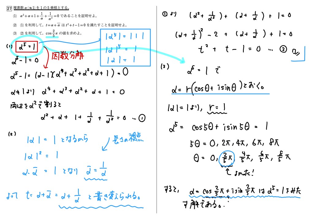 高卒生クラスでは、複素数α(α≠1)の五乗根を求める文章題を扱いました。 生徒は「α⁵=1」という根の公式を前に、どうして複素数には解が5つあるのか、極形式やオイラーの公式を使った複素数表示が理解できず戸惑っていました。