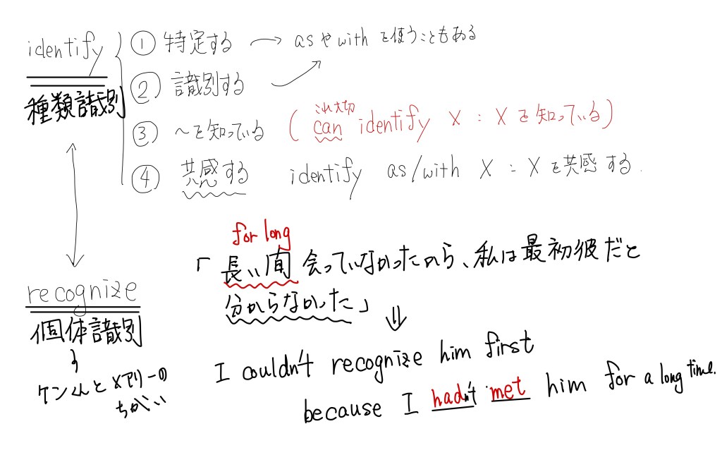 また、今回特に注目したのが「identify」の多義性と使い方です。identifyには 5種類の意味があり、 それぞれの用法と訳し分けを詳しく解説しました。